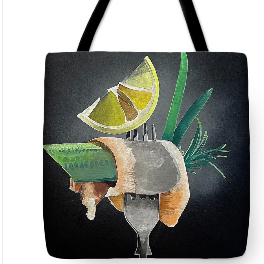 When you wear/use these beautiful and thoughtful totes you are helping create a new brand of ‘casual artwear’ - wearing unique and original ART work that is ‘a meal for your eyes and a feast for your senses’. You will be getting some attention wearing these while helping to keep the planet further free of plastic bags for all your shopping, picnics, fun days and ANY time you need an extra hand! Available in 3 sizes.